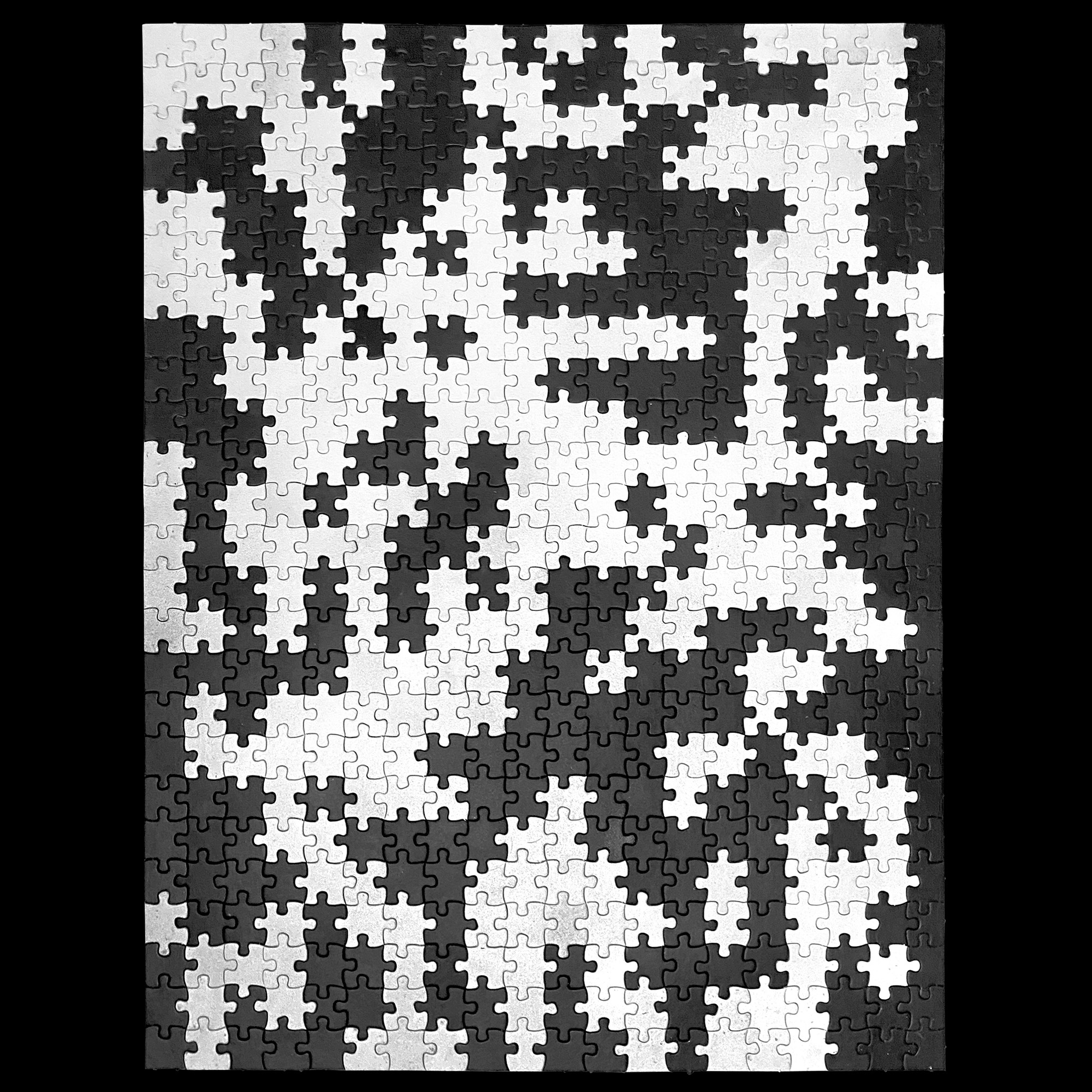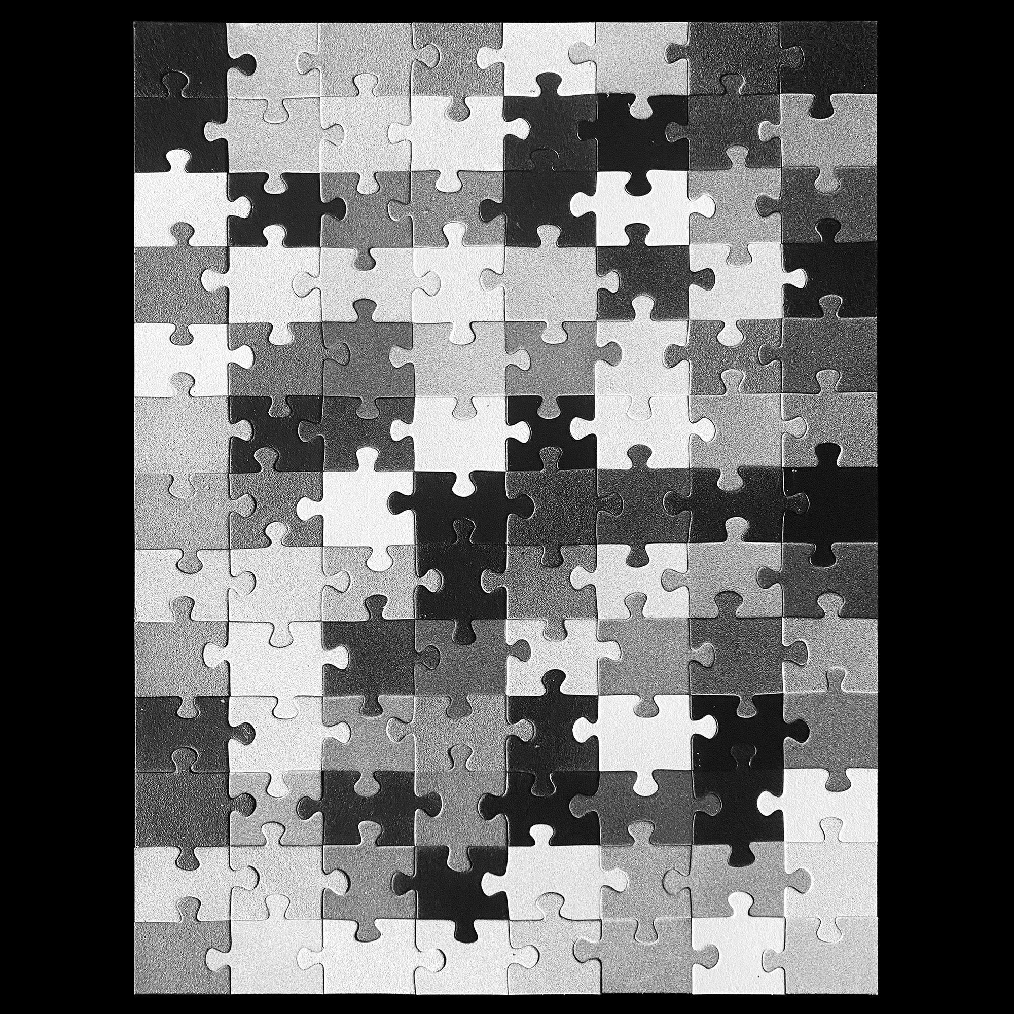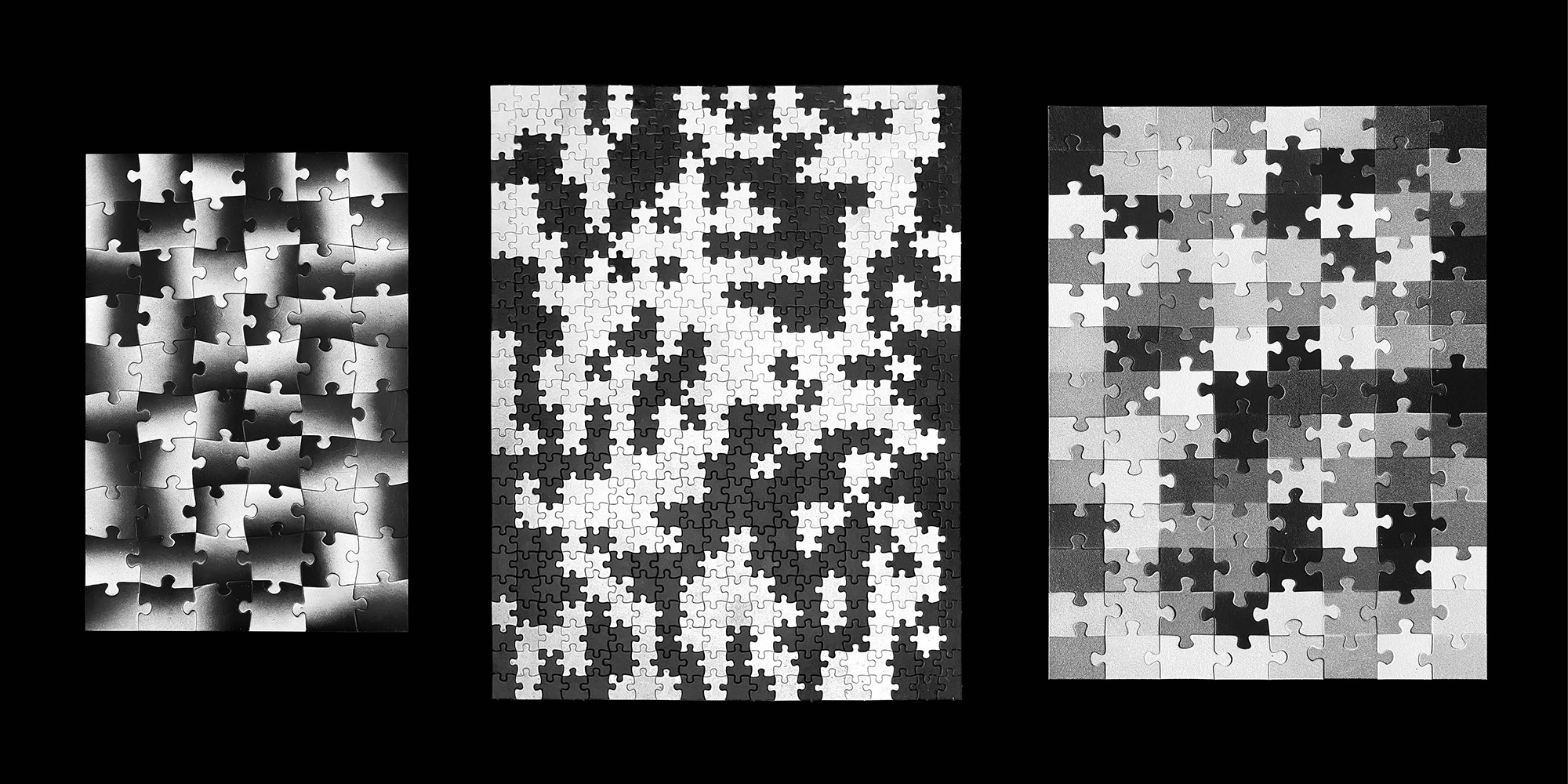 I decided to take an old 500 pieces puzzle and spray one half black and the other white. For the second painting I generated random shades of grey through a spraypainted gradient and the third one randomises gradient orientations.